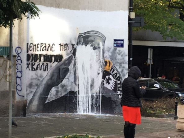 Podsetimo, mural sa likom bivšeg komandanta Vojske Republike Srpske Ratka Mladića, osuđenog u Hagu na doživotni zatvor, oslikan je letos na uglu Njegoševe i Ulice Alekse Nenadovića. Ovako je mural izgledao pre nego što je uništen: