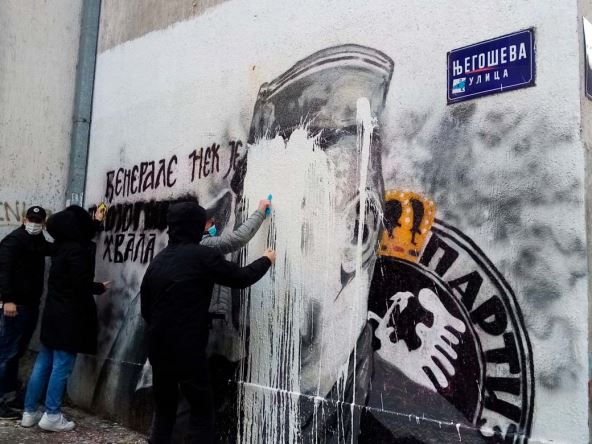 U samom centru Beograda, u Njegoševoj ulici, jutros je na mural generalu Ratku Mladiću i nekadašnjem komandantu VRS bačena bela farba. Mural je uništio Đorđo Žujović, predstavnik Socijaldemokratske partije Srbije, koji je istakao da je to bila njegova "ljudska dužnost". Međutim, nešto posle 13 časova grupa mladića okupila se i izašla da očisti mural.