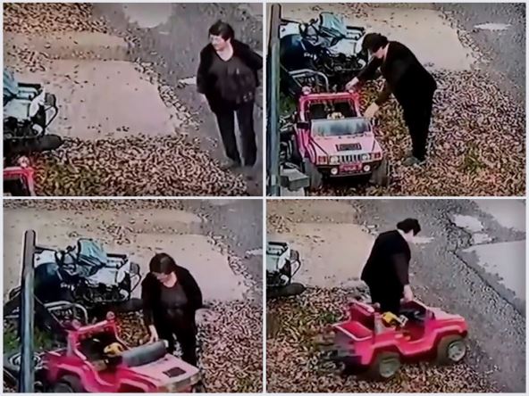 Prethodno se osvrnula oko sebe nekoliko puta, verovatno da se uveri da nema nikoga ko bi mogao da vidi šta radi. Ubrzo, odlazi i "odvozi" električni džip igračku za sobom, a u opisu objave stoji da ga je žena ukrala.