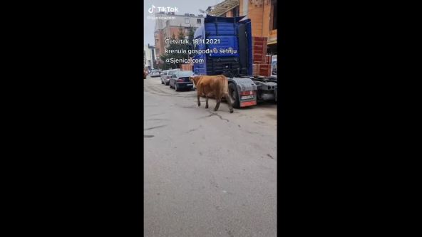 Domaće životinje su se baš odomaćile u Sjenici, pa tako se pojavio snimak krave koja nonšalantno šeta putem, a pojedini stanovnici su bili svedoci šetnje životinje.
