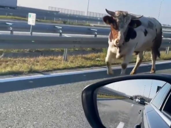 O čemu se radi? Na snimku vidimo pravog pravcatog bika koji je nekako prešao preko bankine i našao se na kolovozu, krećući se u suprotnom smeru na isključenju za Novi Sad.