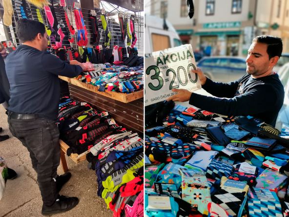 "Čarape ubedljivo najbolje prolaze, a mi se trudimo da imamo najkvalitetnije. Sada je tri para za 200 dinara, materijali za zimu su deblji i onda mora više da košta. Ipak, mušterije kad znaju da valja ne pitaju za ceno", rekao je Gradimir.
