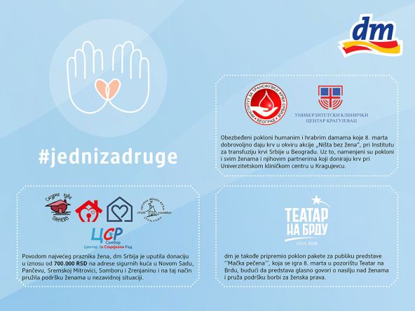 Poklone povodom Osmog marta kompanija je usmerila i humanim damama koje godinama dobrovoljno daju krv u okviru akcije „Ništa bez žena“, pri Institutu za transfuziju krvi Srbije u Beogradu. Uz to, dm je namenio poklone i svim ženama i njihovim partnerima koji na ovaj praznik doniraju krv pri Univerzitetskom kliničkom centru u Kragujevcu.