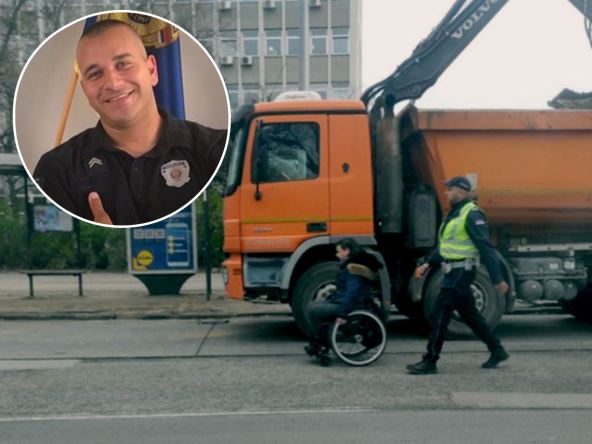 Jovan Vasiljević, saobraćajni policajac iz Novog Sada učinio je divan gest kada je zaustavio na kratko saobraćaj kako bi devojci u kolicima pomogao da pređe ulicu.