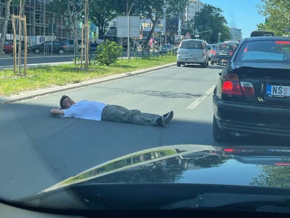 Nepoznati muškarac legao je na bulevar i blokirao saobraćaj. Ovim postupkom dovodi u opasnost svoj, ali i živote drugih učesnika u saobraćaju. - Piše ispod fotografije koja je objavljena na društvenoj mreži Instagram.