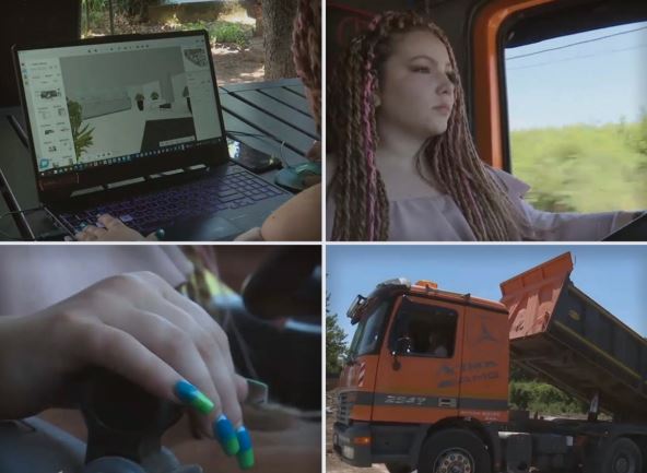 "Vozim ove solo kamione, šlepere, vozim i ove radne mašine, bagere, valjak, utovarivač i sve to što treba na gradilištu, zavisno od situacije. Ustanem ujutru, idem na predavanja, na faks. Posle toga vraćam se kući i odmah u kamion. Kad završim, završim, obično to bude do kasno u noć", dodaje Jovana.