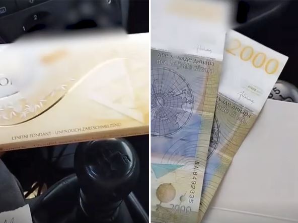 Poruka izvinjenja je bila čokolada, ali ne obična čokolada. Žena je uzela čokoladu u ruke, ali je primetila da je pakovanje lagano i da tu nešto ne štima. Otvorila je čokoladu, a unutra su bile četiri hiljade dinara. Žena je ušla u svoj automobil i snimila sve. Zamolila je čoveka koji je ovo uradio da joj se javi na "Instagramu".