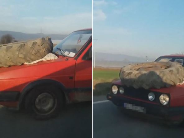 Neverovatan video-snimak na kome se vidi kako muškarac prevozi traktorsku gumu na haubi osvanuo je na Instagram stranici "192_rs". Neobičan prizor snimljen je, kako se navodi, na putu Vlasotince-Leskovac