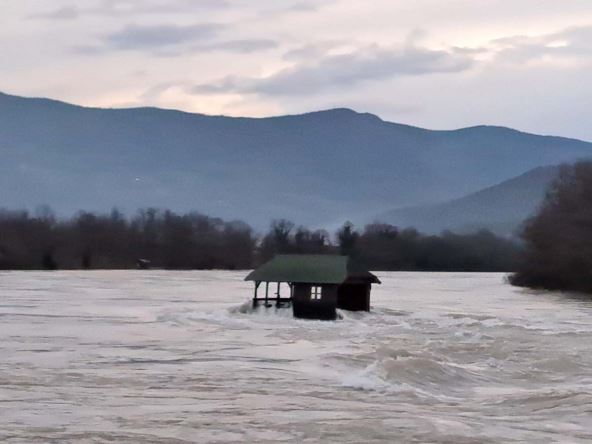 Ogromne padavine na teritoriji Bajine Baše ponovo su u opasnost dovele najveću turističku atrakciju ove opštine. Kućica na steni jedva odoleva naletima nabujale Drine. Ipak, meštani se nadaju da će kao i mnogo puta do sada opva neobična građevina izdržati.