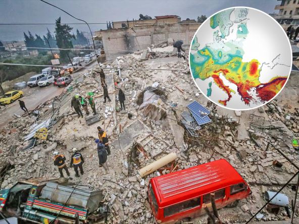 Evropska mapa seizmičke opasnosti prikazuje seizmičko kretanje tla za koje se očekuje da će se desiti sa verovatnoćom odstupanja od 10 odsto tokom narednih 50 godina. Plavo-zelene boje označavaju oblasti u kojima je opasnost od zemljotresa relativno niska, žuta i narandžasta boja označavaju područja umerene opasnosti, a crvene boje označavaju područja visoke opasnosti.