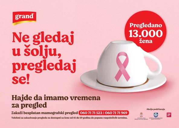 U želji da promeni negativnu statistiku koja kaže da svake godine čak 4.000 žena u Srbiji oboli od raka dojke, a 1.600 izgubi život, Grand kafa zajedno sa partnerima nastavlja borbu protiv najčešćeg malignog tumora kod žena. Uz poruku „Ne gledaj u šolju, pregledaj se“, Grand kafa poziva dame da ovog marta poklone sebi – pregled, jer je bolest otkrivena u ranoj fazi lakše izlečiva.