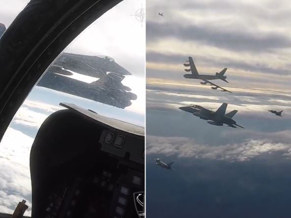 Spektakularni snimak, snimljen iz pilotske kabine jednog od dva nuklearna bombardera B-52 Stratofortress, prikazuje kako lebdi iznad oblaka pored NATO borbenih aviona. Vazdušna komanda NATO-a je na Tviteru objavila da "B-52 treniraju sa savezničkim vazduhoplovnim snagama tokom svoje BTF misije "jačanja našeg evroatlantskog partnerstva" usred pojačanih tenzija u regionu.