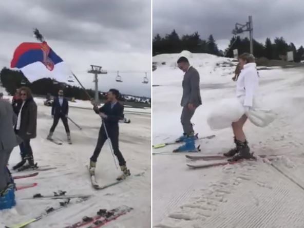 "Svadbena svita koju su činili mladenci, njihovi roditelji, kumovi i svi svatovi koji znaju da skijaju krenula je sa vrha, a potom se zastavila na polovini staze gde se održalo građansko venčanje, i na kraju su se spustili do podnožja gde je žurka nastavljena", kaže pevač koji se našao na ovom neobičnom veselju.