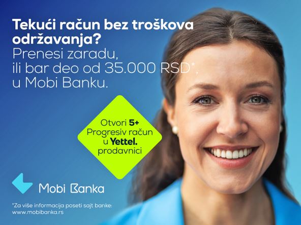 Ovo je samo jedna od pogodnosti koje Mobi Banka nudi u okviru nove 5+ ponude, jedinstvene na tržištu i definisane po ugledu na vodeće digitalne banke u svetu. Ukoliko prenesete 35.000 zarade u Mobi Banku i pritom se odlučite za Progresiv paket, možete da koristite gotovo sve bankarske usluge u vezi sa tekućim računom bez naknade.
