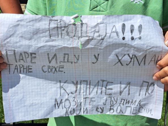 "Prodaja, pare idu u humanitarne svrhe. Kupite i pomozite ljudima koji su bolesni", piše na komadu papira. Ispod ove objave u grupi nizali su se komentari korisnika. "Veliko bravo za naše drugare. Svaka čast, veliki ljudi", piše u jednom komentaru, dok u drugom stoji: "Slatkiši svaka vam čast nek vas čuva dragi Bog. Bravo deco pokažite pojedinim odraslima".