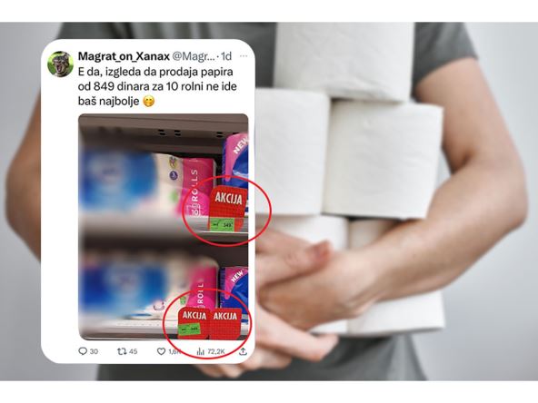 U jednom velikom trgovinskom lancu osvanuo je popust od čak 70 odsto za 10 rolni toalet-papira poznatog proizvođača, pa tako umesto 850 cena mu je 350 dinara na akciji. Iako svi vole akcije posebno danas kada svakog dana nešto poskupljuje, ovo pojeftinjenje je privuklo veliku pažnju na društvenim mrežama. "Ako ga prodaje za 70 posto manje novca, a kvalitetan je, što nikad nema neki dobar auto na takvom sniženju ili dobar stan?", zapitao se jedan korisnik Tvitera. S punim pravom, mnogi su se zapitali kako se isplati prodati toliko jeftino navodno kvalitetan proizvod kada su najavljena nova poskupljenja sirovine od koje se pravi kvalitetan toalet-papir. Naime, cene celuloze, i beljene i nebeljene, već su skočile, a to se odražava i na toalet-papir. Pored te sirovine, poskupili su i energenti koji su, naravno, neophodni u fabrikama velikih proizvođača. Na sve te pojačane troškove, strani proizvođači imaju i utrošak za transport robe do Srbije. U startu su njihovi proizvodi, ukoliko su istog kvaliteta kao domaći, skuplji bar za taj transport. Međutim, mi na našem tržištu nemamo tu sliku već potpuno suprotnu. Veliki strani proizvođač daje svoj toalet-papir za bagatelu pa se postavljaju dva pitanja. Jedno je od kojeg je materijala taj papir zaista napravljen, jer cene sirovina su skočile i apsolutno je nemoguće sa ultrajeftinom cenom pokriti trošak nabavke, a znamo da sigurno neće prodavati na svoju štetu. Poznato je da je u srednjem sloju toalet-papira velikog stranog proizvođača i reciklirani papir, koji je teži, pa rolne deluju deblje. Drugo pitanje je da li je uopšte prva cena od 850 dinara u trgovinskom lancu bila opravdana ako ni sa 70 odsto pojeftinjenja proizvođač nije na gubitku? Stiče se utisak da bi u tom slučaju, zapravo samo napravljen "hajp" sa sniženjem, trik kojim se služe prodavci. Podignu visoko cenu, pa onda je spuste na realnu. Koji god od ova dva scenarija da je istinit, kupci se osećaju prevareno, jer sve vreme u stvari kupuju "kvalitetan toalet-papir" sa umetnutim recikliranim srednjim slojem po previsokoj ceni. Zato su komentari mnogih da će se okrenuti domaćem proizvođaču koji pravi toalet-papir od 100 odsto celuloze.