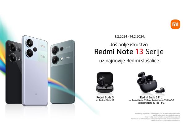 Ukoliko se odlučite za kupovinu Redmi Note 13 telefona, na poklon dobijate Redmi Buds 5 dizajnirane za unapređeno zvučno iskustvo sa tri režima transparentnosti, do deset sati neprekidnog slušanja i do 40 sati upotrebe kada je uparen sa futrolom za punjenje.