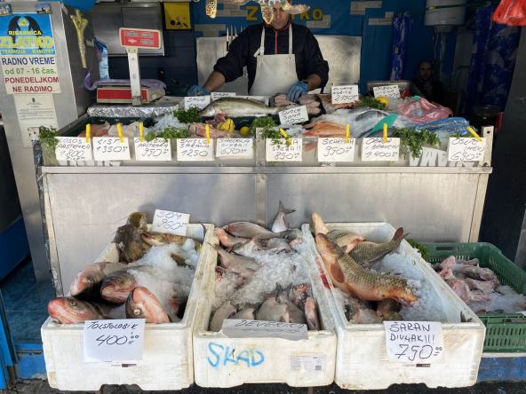 "Od morske ribe najviše se prodaje skuša i pastrmka. Takođe, fileti oslića, som pangasius. Od sveže ribe najviše pastrmke, šarana i losos. On je nešto suplji ali ide jako lepo", rekao je prodavac Zdravko Bartula.