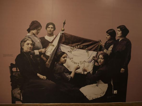 Na samom ulazu fotografija Darinke Nikolić, upravnice Doma učenica u Beogradu, lajt-motive je izložbe - nastavnice i starije učenice Radničke škole i Više ženske škole prave pukovske zastave. Iste one koje će srpska vojska nositi i kroz Albansku golgotu, ali i proboj Solunskog fronta, i sve na broju pobedonosno vratiti u Srbiju 1918.
