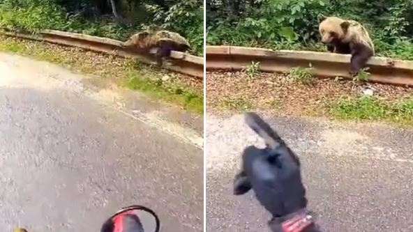 Na snimku objavljenom na društvenoj mreži X, vidi se kako medved mirno stoji, potpuno nezainteresovan za prolaznike. Dok bi se zasigurno većina nas preznojila od straha pred divljom zveri, motociklista se sa njim pozdravio kao sa dobrim drugom. Medo je nastavio da uživa i posmatra magistralu, kao da je to njegova svakodnevna rutina.