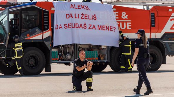 Petar, vatrogasac na niškom aerodromu, došao je na ideju da svoju devojjku Aleksandru zaprosi na nesvakidašnji način, a ovaj romantičan čin, objavio je i Aerodrom Konstantin Veliki na svom zvaničnom Fejsbuku.