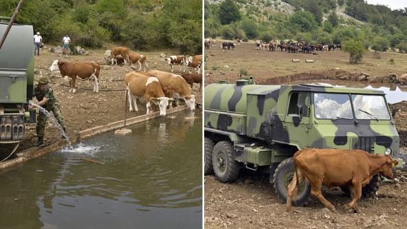 Na ovom zadatku angažovani su pripadnici Kopnene vojske sa dve cisterne, koji u više tura tokom dana dopremaju vodu za oko 1.000 ugroženih konja i krava.