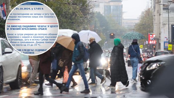 "Danas i sutra umereno do potpuno oblačno i sveže, povremeno s kišom i lokalnim pljuskovima, koji će na jugozapadu, jugu i istoku Srbije ponegde biti praćeni i grmljavinom. Dnevna temperatura u većini mesta od 15 do 19 °C", najavljeno je.