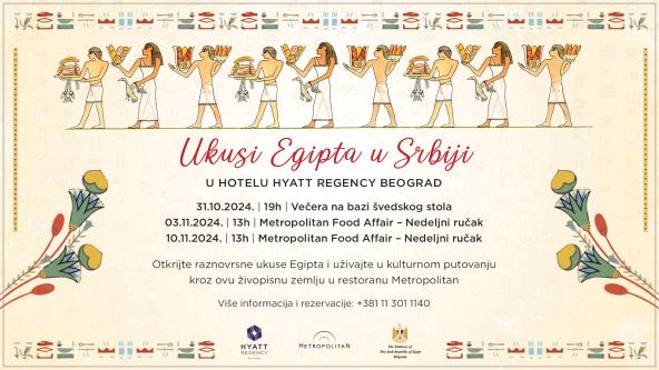 Kroz manifestaciju “Ukusi Egipta u Srbiji”, koju hotel organizuje u saradnji sa Egipatskom ambasadom u Beogradu, svi ljubitelji hrane i kulture imaće priliku da istraže bogatu i drevnu baštinu Egipta kroz autentične kulinarske specijalitete i nesvakidašnje običaje i aktivnosti.