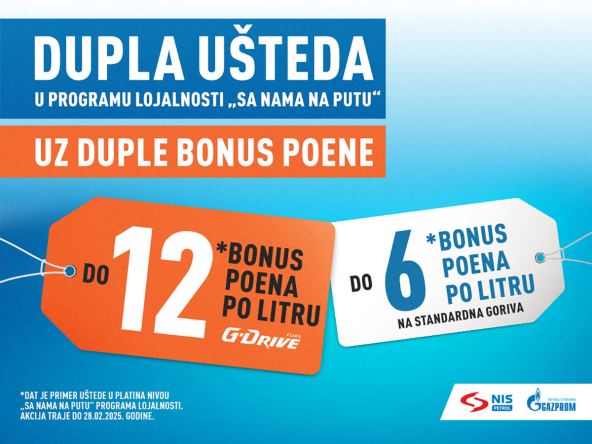 Do kraja februara, program lojalnosti „Sa nama na putu“ nudi vozačima sjajnu priliku za uštedu! Naime, svi potrošači prilikom kupovine goriva na bilo kojoj od NIS Petrol ili Gasprom benzinskih stanica u Srbiji, ostvariće duple bonus poene uz svoju „Sa nama na putu“ karticu ili mobilnu aplikaciju. To znači da se uz svaku kupovinu bilo koje vrste i količine goriva, do 28. februara bonus poeni dupliraju, što omogućava uštedu i do 12 dinara po litru premijum goriva, odnosno do 6 dinara po litru standardnog goriva – u nivou lojalnosti „Platina“.