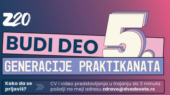 Platforma Zdravo dvadesete sada već tradicionalno organizuje konkurs sa ciljem da odabere četiri praktikanta koji će svoje kreativne ideje i predloge moći da pretoče u edukativni sadržaj namenjen upravo njihovim vršnjacima. Praksa je otvorena za studente osnovnih ili master studija koji nisu u radnom odnosu i imaju prebivalište u Srbiji.