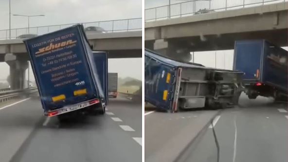 Teretni kamion se kretao ka Surčinu i tačno ispod nadvožnjaka je olujni vetar prevrnuo prikolicu! Snimak je objavljen na društvenim mrežama, sve je zabeležila kamera vozača koji je bio iza kamiona.
