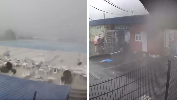 Kako se i na jednom od snimaka sa sigurnosnih kamera može videti, jak vetar rušio je sve pred sobom, nosio ležaljke, čak i vodu iz bazena. Popadali su suncobrani, kao i grane po putu.