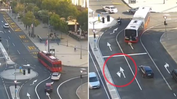 Kako se vidi na snimku objavljenom na društvenim mrežama saobraćajna signalizacija na kolovozu pred ulazak u kružni tok kod hotela Moskva, odnosno na Terazijama, ima strelicu koja pokazuje da se ide pravo, ali ima i strelicu koja pokazuje i skretanje levo.Zbog toga neki vozači pomisle da mogu da skrenu levo u kružnom toku, što je velika greška.