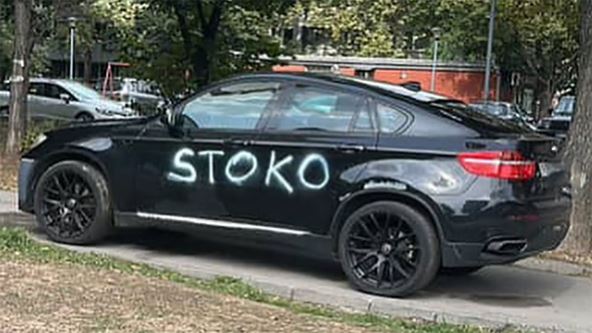 Na Instagram stranici "moj_beo_grad" objavljene su fotografije automobila marke BMW, koji je parkiran nasred pešačkog puta u Bloku 38. Ono što je privuklo najviše pažnje jeste to što je vozilo belom farbom išarano uvredama, među kojima se ističu poruke: "Stoko!" i "Seljačino!"