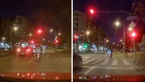 Na pomenutom snimku se vidi kako dostavljač brze hrane usporava na semaforu dok vozi skuter. Onda odjednom ipak dodaje gas i prolazi lagano.