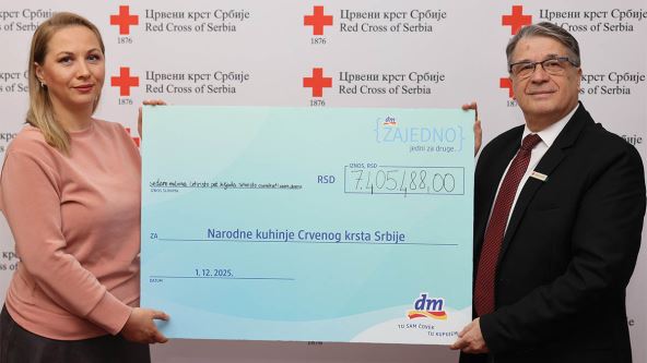 Beograd, 1. 12. 2025 – Zahvaljujući hiljadama kupaca koji su i ove godine učestvovali u inicijativi Giving Friday, kompanija dm donirala je rekordnih 7.405.488,00 dinara Narodnim kuhinjama Crvenog krsta Srbije. Donacija je obezbeđena izdvajanjem 5% od celokupnog prometa ostvarenog 28. novembra u svim dm prodavnicama i na online kanalima, čime je nastavljena dugogodišnja tradicija kompanije dm posvećena pomoći onima kojima je podrška najpotrebnija.