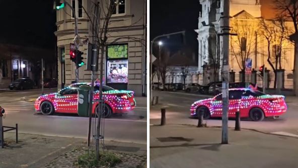 Crveni automobil je u potpunosti prekriven lampicama koje menjaju boju dok svetle. Provozao se kroz centar grada, a "Instagram" stranica "Zdravo Pančevo" objavila je snimak ukrašenog vozila koje ima i dve srpske zastave.