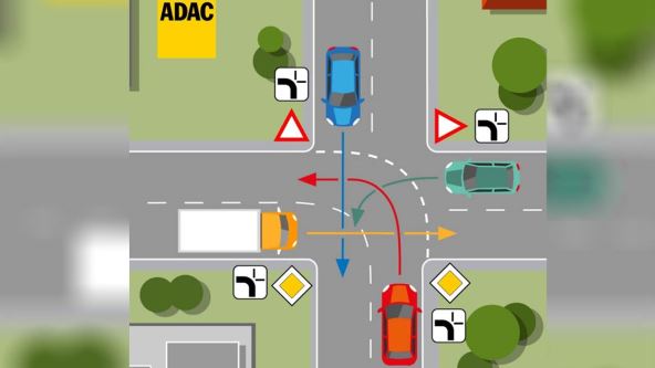 Kroz raskrsnicu prvi prolazi crveni automobil, zbog toga što on ostaje na putu sa pravom prvenstva prolaza. Za njim prolazi žuti kamion, budući da dolazi sa puta sa pravom prvenstva prolaza na put bez pravom prvenstva.