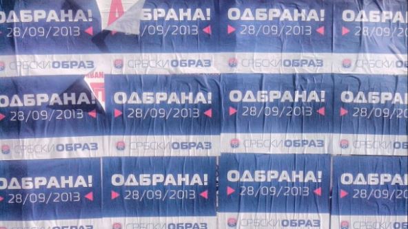 Plakati su plavo-bele boje i na njima je i grb koji asocira na zabranjenu ekstremističku organizaciju "Obraz".