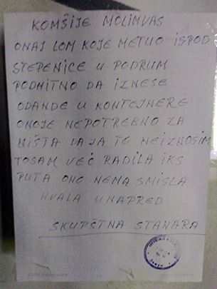 Onaj lom koje metuo ispod stepenice u podrum podhitno da iznese odande u kontejnere onoje nepotrebno za ništa da ja to neiznosim tosam već radila iks puta ono nema smisla