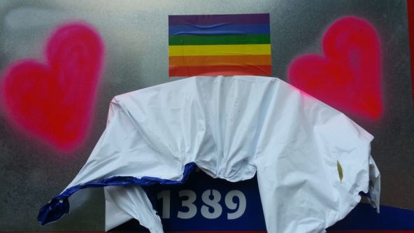 Nepoznate osobe su u noći između četvrtka i petka na tabli koju je ostavio nacionalistički pokret SNP 1389 ostavili svoje simbole - zastavu duginih boja, srca i poruku "LGBT frendli".