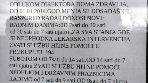 Naime, pre nekoliko dana ih je na vratima Doma zdravlja dočekao natpis na kome piše da ukoliko nekome treba hitna intervencija u toku noći će morati da se obrati hitnoj službi u Prokuplju, koje je udaljeno preko 30 kilometara.