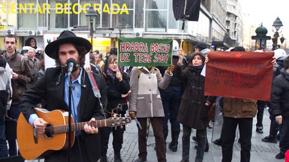 Okupljeni su nosili transparente podrške "Danas Tuzla, sutra Beograd", "Stop represiji", "Kapitalizam je u krizi, policijska represija ga neće spasiti", "Nacionalisti u službi krupnog kapitala, pozdrav za antifašiste Tuzle", "Hrabra Bosno, uz tebe smo" ali i one kritike Beograđana – "U Bosni bunt, a u Beogradu se bleji u Mc-u".