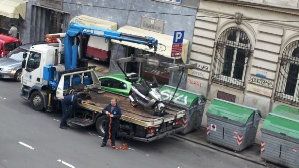 Na Obilićevom vencu neregistrovani skuter nepoznatog vlasnika već duže vreme je zauzimao mesto u jednoj garaži, pa je vlasnik garaže pozvao službu Parking servisa da ga odnese.