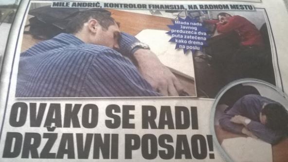 Međutim, apsurd je što će u međuvremenu, kako piše ispod fotki usnulog Mileta, biti otpušteno troje starih, višegodišnjih radnika, i to jer su tehnološki višak u koji nikako ne spadaju pridošle mlade nade.