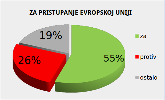 Kako je rekla direktorka istraživanja i razvoja TNS Medium Galupa, Milana Aleksić, na konferenciji za novinare, 59 odsto građana podržava članstvo Srbije u EU, a ukoliko bi referendum o pristupanju Srbije EU bio održan danas, 55 odsto građana glasalo bi "za", dok bi 26 odsto bilo "protiv".