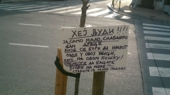 Na drvetu u Ulici carice Milice neko je okačio ovu poruku, verovatno iritiran činjenicom da prolaznicima ograđeni prostor oko mladice služi kao korpa za otpatke.