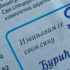 Elektro-inženjer Branko Đurić (56) za "Politiku" kaže da je na ideju da da oglas došao kada je u rubrici "Među nama" tog beogradskog dnevnika video teks iz četrdesetih godina prošlog veka u kome se jedan otac takođe izvinjava detetu što nije verovao u njega.