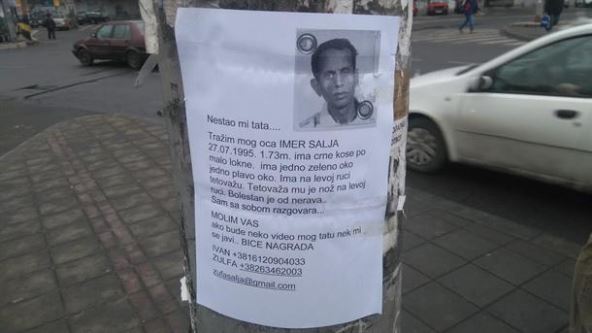 “Nestao mi tata: Tražim mog oca Imera Šalju, 173 cm, (rođen 1959.) ima crnu kosu, po malo lokne, ima jedno zeleno oko, jedno plavo oko. Ima na levoj ruci tetovažu. Tetovaža mu je nož. Bolestan je od nerava, sam sa sobom razgovara", piše u oglasu.