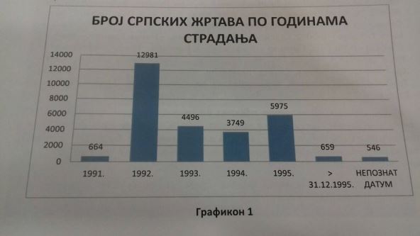 Od ukupnog broja stradalo je 2.385 žena i 447 dece. Po godinama, najviše Srba stradalo je 1992. i to 12.981 ili 45 odsto.